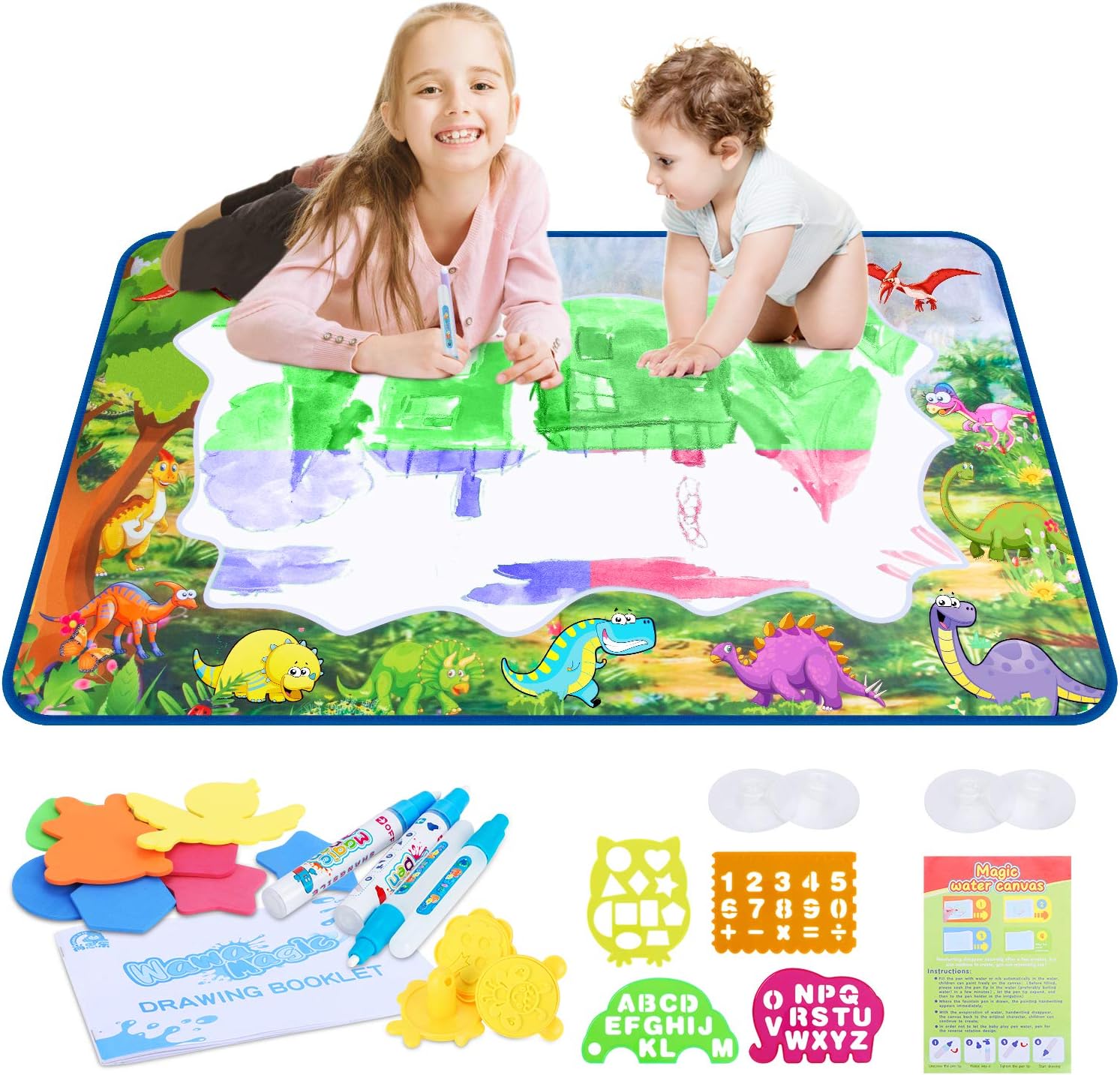 【Doodle Librement】Il suffit de remplir les stylos avec de l'eau propre et de dessiner sur le tapis de dessin à l'eau. Pas d'encre, pas de peinture. Pas besoin de nettoyage supplémentaire. Le dos du Water Drawing Mat est en nylon résistant à l'eau. Maman ne craint pas de mouiller le sol.